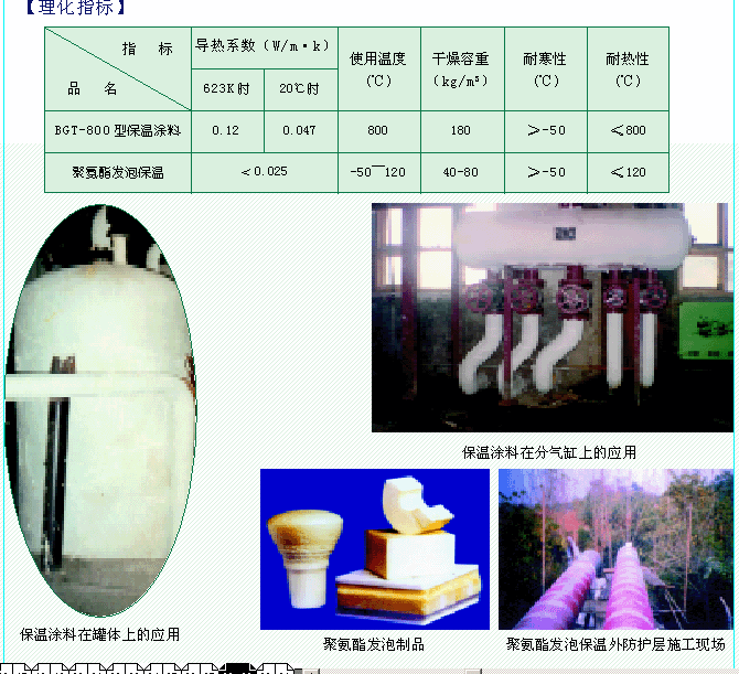 BGT-800型復(fù)合硅酸鎂保溫涂料是一種新型無(wú)機(jī)微孔網(wǎng)狀輕質(zhì)高效保溫材料,產(chǎn)品屬于不定型膏狀,施工方便、絕熱性能好、不開(kāi)裂、不粉化、不脫落??蓮V泛應(yīng)用于化工、電力、冶金、石油等行業(yè)的高溫管道,尤其適用于異型熱力管網(wǎng)及閘、閥、球體的保溫隔熱。經(jīng)檢測(cè),其各項(xiàng)性能指標(biāo)均優(yōu)于其它傳統(tǒng)保溫材料。